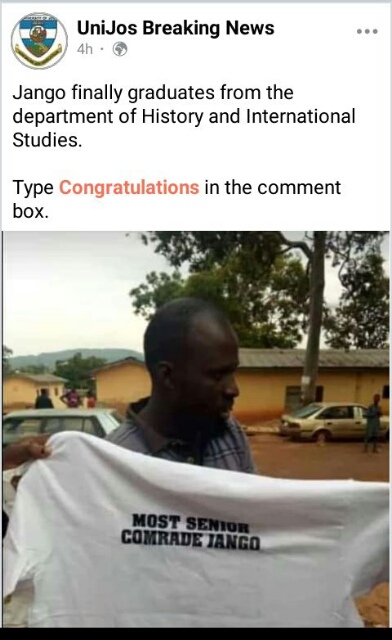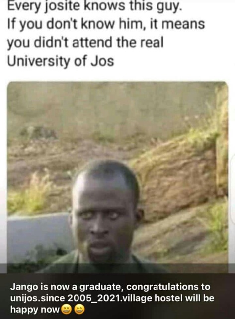 Meet Jango, most senior comrade of Unijos ,he has been a student of the institution for the past 13yrs, Jango signed out today after 13yrs grin