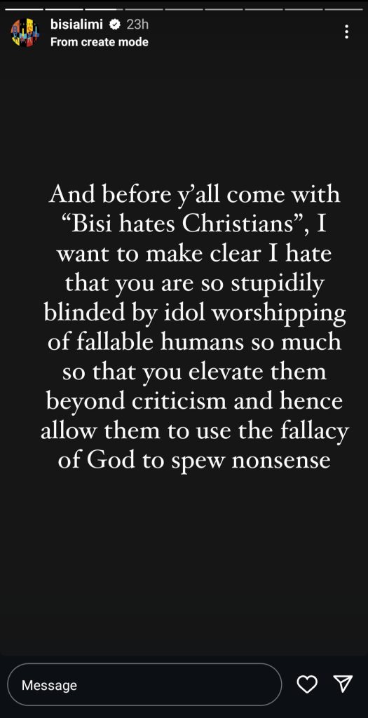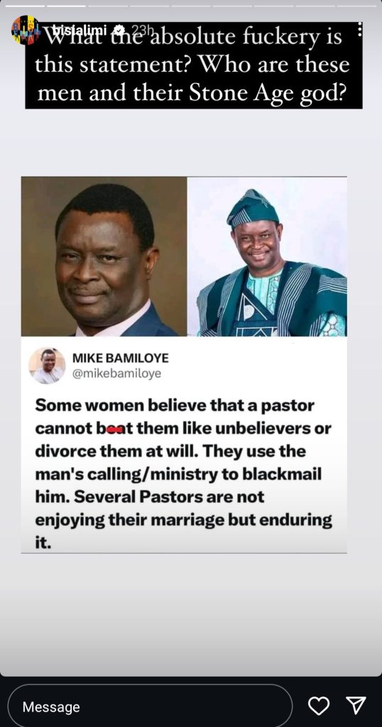 Bisi added while reacting to Bamiloye’s stament, “What the absolute f**kery is they statement? Who are these men and their stone age gods?”