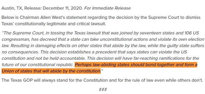 Texas GOP chairman suggests ‘Constitution-abiding states should form a UNION’ after SCOTUS tosses election suit.