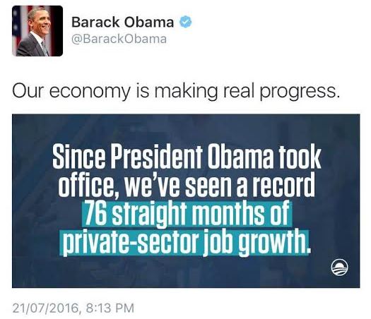 Americans come for Barack Obama after he tweets that there's been more jobs &economic growth since he became president - 9jaflaver