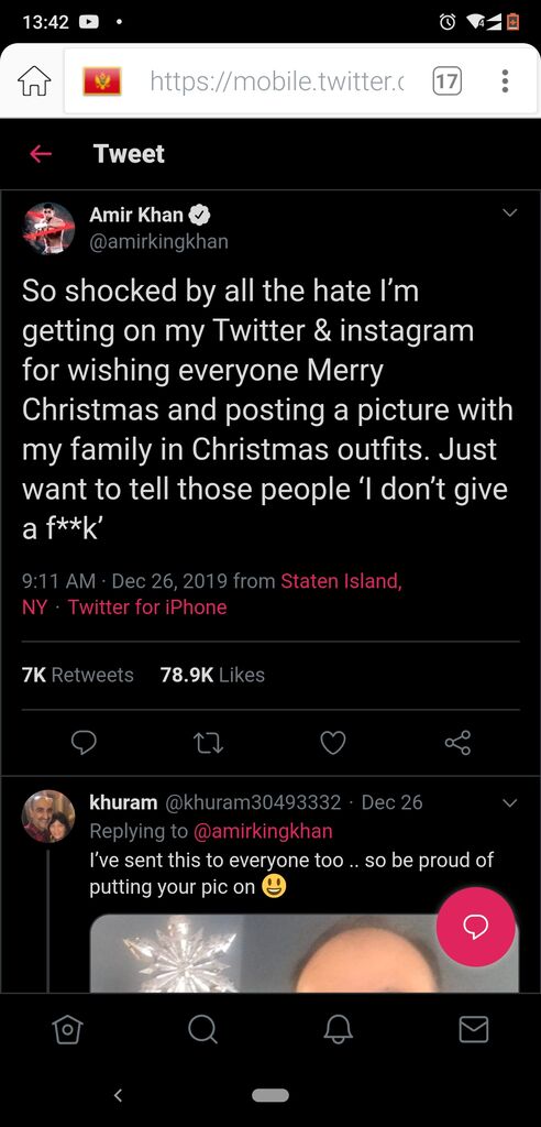 British boxer Amir Khan has taken to his Twitter handle to express his disappointment and defiance towards his fellow muslims who called him an infidel and threatened his family for celebrating Christmas.
