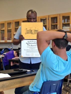 According to a North Carolina student Calli Thurlow (@CSThurlow) who shared the funny photos on twitter yesterday, their chemistry teacher Mr Akamu Jude Ewunkem walked around classrooms showing off his new degree to students and staff.