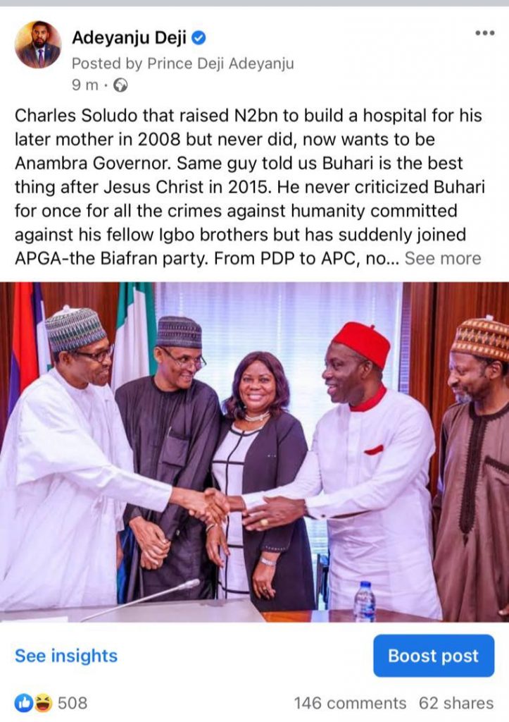 Charles Soludo that raised N2bn to build a hospital for his later mother in 2008 but never did, now wants to be Anambra Governor. Same guy told us Buhari is the best thing after Jesus Christ in 2015. He never criticized Buhari for once for all the crimes against humanity committed against his fellow Igbo brothers but has suddenly joined APGA-the Biafran party. From PDP to APC, now APGA. Always jumping up & down like a monkey. As CBN Gov, this guy didn’t employ one person from his state but he’s suddenly Pro-Igbo. I don’t blame Soludo, it’s those that rate him I blame. He lacks character.