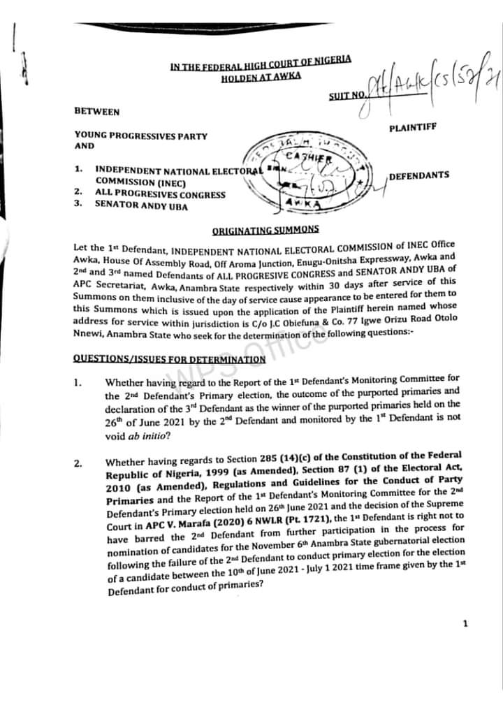In a related development, the YPP on Friday, asked the Federal High Court, Awka to determine whether the purported Primary conducted by the All Progressives Congress on 26th June, 2021 which produced Senator Andy Uba as the party’s flag bearer should be voided or not.