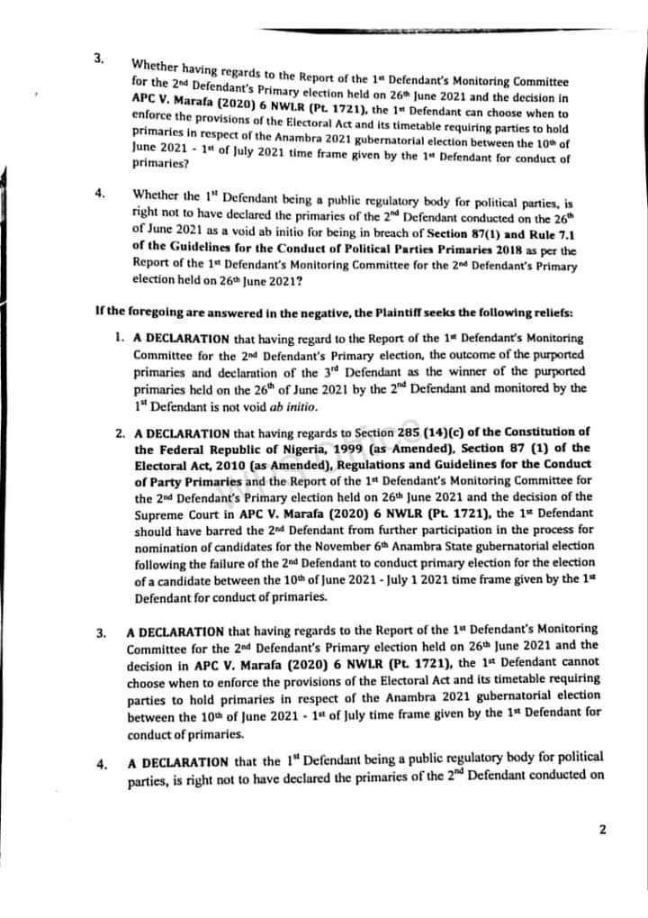 It also asked the Court to interpret the regulations and guidelines for the conduct of party primaries as provided by the Independent National Electoral Commission for the conduct of the 2021 Anambra State Governorship Election in view of the primaries held by the PDP and the APC.