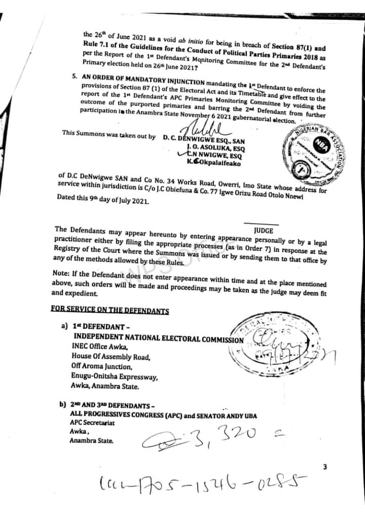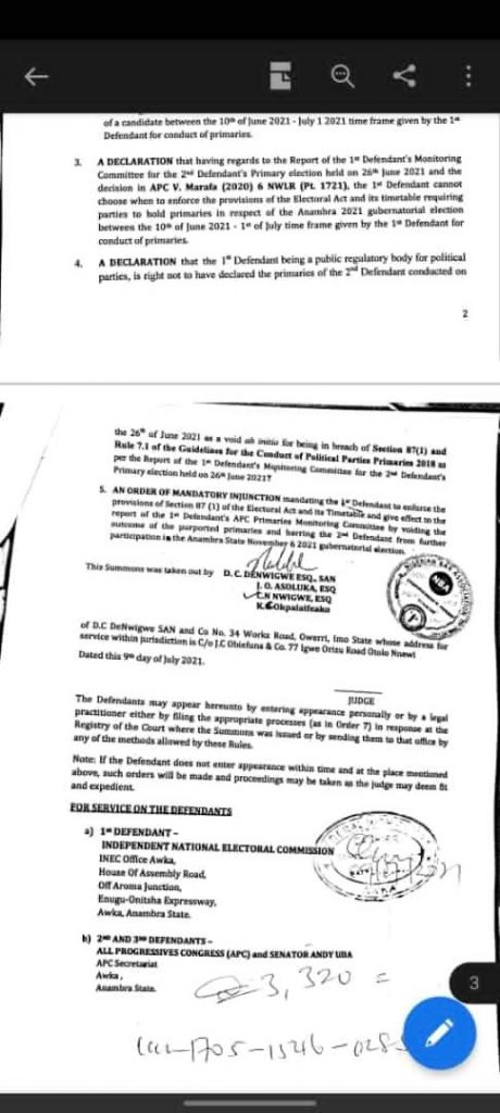 In the Suit No. FHC/AWK/C5/52/21, the party through D.C DeNwigwe, SAN, asked the Court to determine the validity of the aforementioned Primary in view of Section 285 (14)(c) of the Constitution, Section 87(1) of the Electoral Act, 2010 as well as the guidelines for the conduct of party primaries as provided by INEC and the Commission’s Monitoring Committee Report on the purported Primary conducted by the APC.