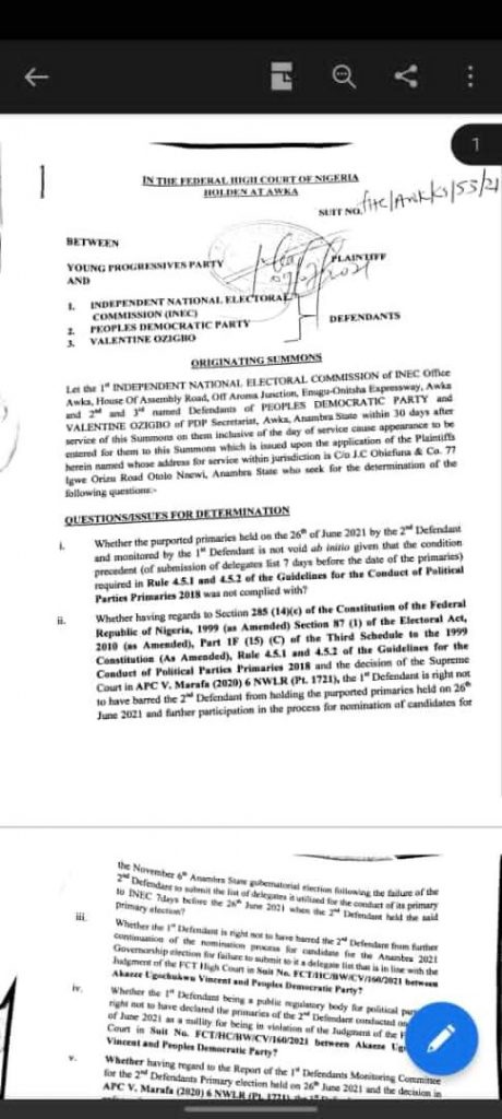 In the suit No. FHC/AWK/C5/53/21 filed at the Federal High Court Awka on its behalf by D.C DeNwigwe, SAN, the YPP asked the Court to determine the validity or otherwise of the primary which the PDP conducted on 26th June, 2021.