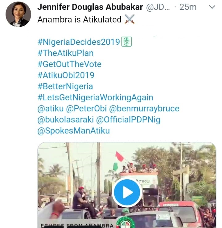 Atiku Abubakar’s wife, Jennifer shared this impressive video from Atiku’s massive campaign in Onitsha, Anambra State.