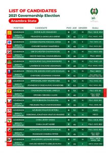 The Independent National Electoral Commission in Anambra state on Friday released a comprehensive list of all candidates to partake in the 2021 Anambra governorship election.