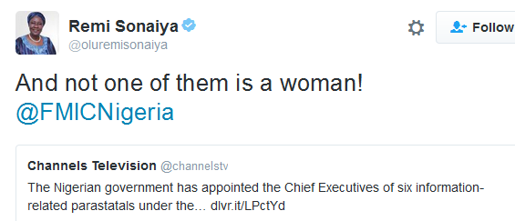The retired Professor of French and Applied Linguistics shared the news on twitter, writing: “And not one of them is a woman! @FMICNigeria”