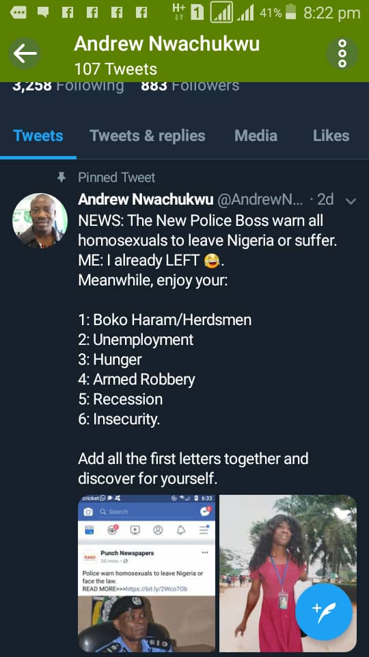 Mr. Andrew NWACHUKWU, An LGBT rights activist, who was uncomfortable with the pronouncement took to his social media hands to mock the police telling them to enjoy their Boko Haram, Unemployment, Herdsmen, Armed robbery, recession and insecurity that he had left already.