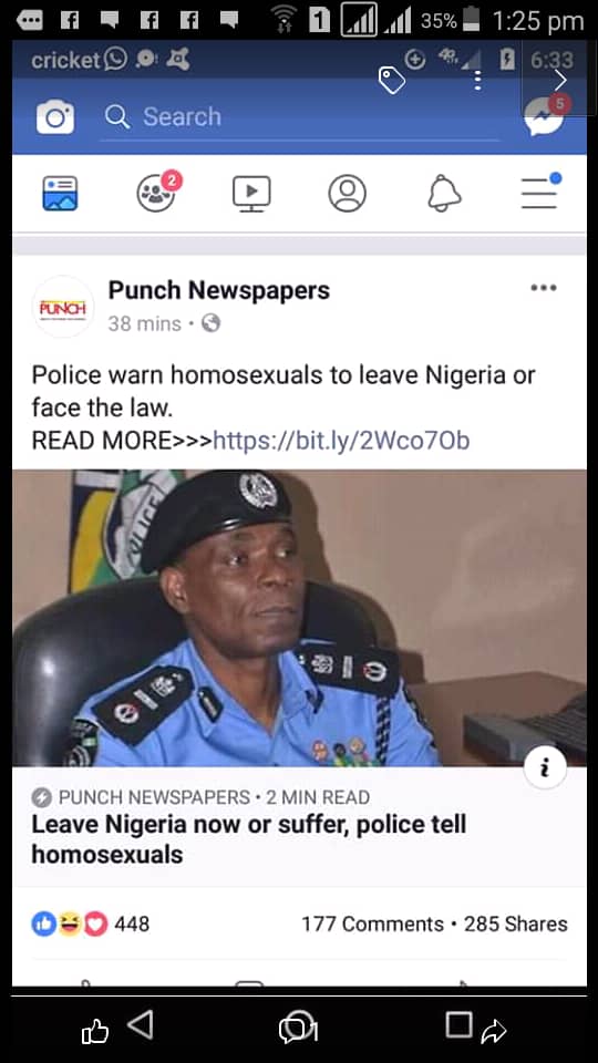 A suspected Nigerian homosexual has reportedly been declared wanted by the police following his unguarded Social Media attack on the police. His posts mocked the warning from The Nigeria Police Force against all homosexuals in the country