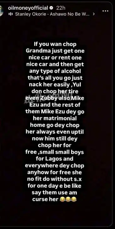 “Small small boys for Lagos and everywhere dey chop her anyhow for free. She no fit do without sex for one day”, He noted.