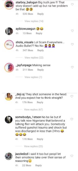 A Titi Diva wrote ” Finally! Someone spoke my mind 🙌, the story doesn’t just add up. I no know say audio assassination sef dey. It is well. We go dey alright laslas 🙏. I sha pray she heals quickly”   One June Patto wrote “I really wonder also when she said for 30 minutes….was that a war? Haahahaa… 3 minutes is enough for assassins to come closer and finish with you…and also I saw the car no bullet points..Sister tell us waity sup na”   Check out some screenshots of comments below: