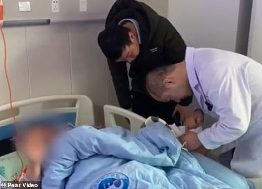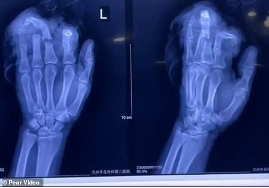 ‘The patient’s left index, middle, ring and little fingers were completely severed. There was seriously damage to the bone,’ a doctor at the Lanzhou Hand & Foot Surgical Hospital told reporters on Friday.