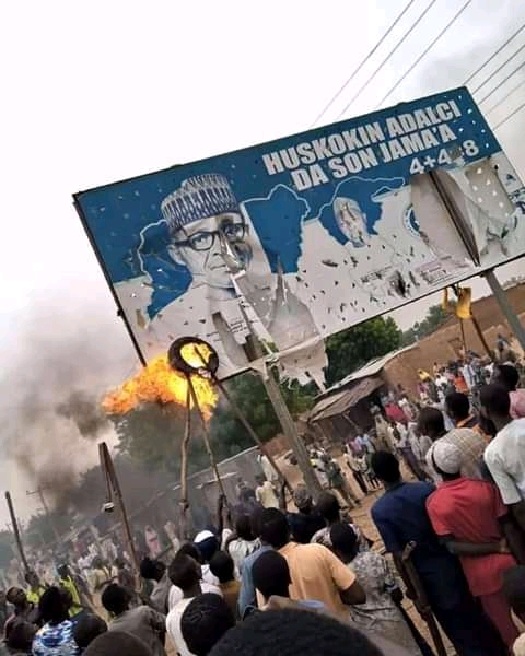 A billboard bearing the picture of President Muhammadu Buhari and logo of the All Progressives Congress (APC) has been burnt by protesters in Yantumaki town, Danmusa local government area of Katsina state.