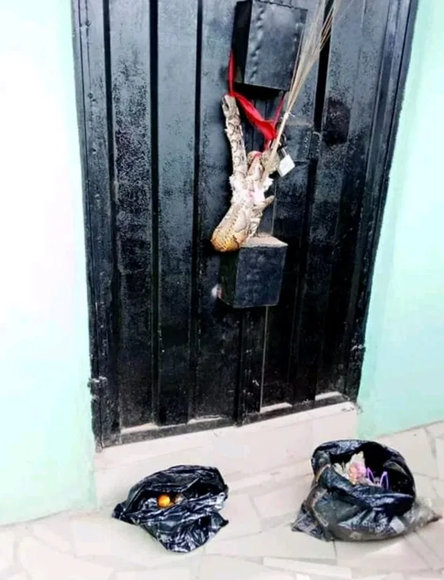 According to reports, the husband who is based abroad, abandoned his wife with three children for the young lady. His unhappy wife reportedly prepared the charm and placed it in front of the lady’s shop, to cast a spell on her and make her stay away from her husband.