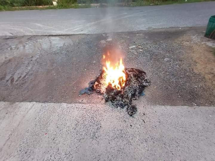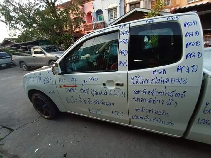 Using a magic marker, the woman identified as Wachiraporn suksawat on Facebook, wrote lots of angry messages in the Thai language. She also set his clothes on fire.
