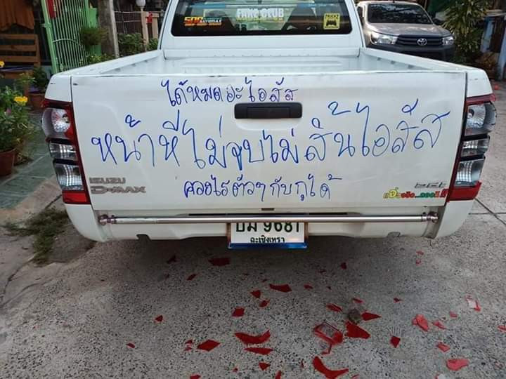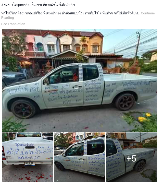 Thai social media users are widely sharing photos that an angry Thai wife posted on Facebook of her husband’s car.