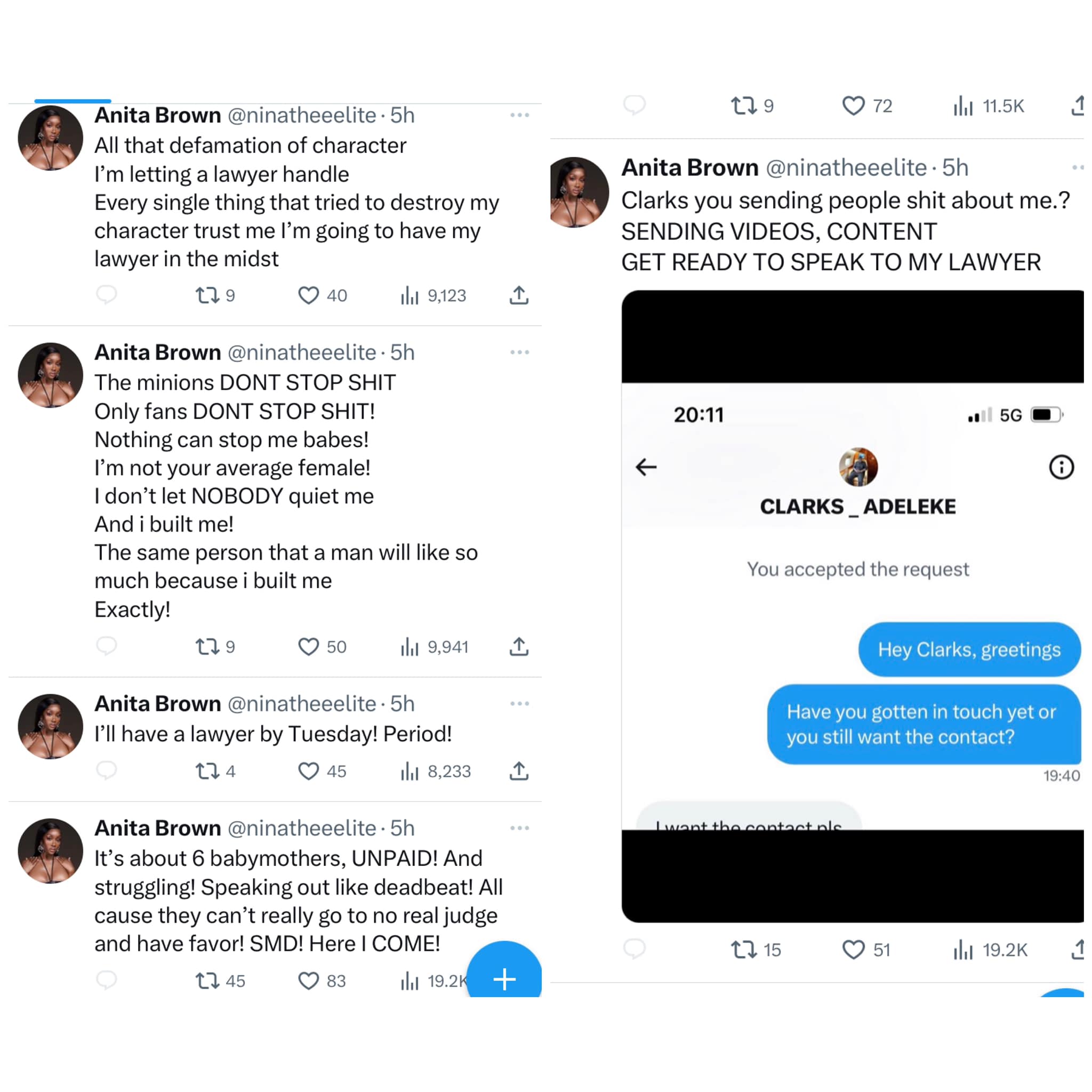 “All that defamation of character I’m letting a lawyer handle Every single thing that tried to destroy my character trust me I’m going to have my lawyer in the midst. Clarks you sending people shit about me.? SENDING VIDEOS, CONTENT GET READY TO SPEAK TO MY LAWYER”