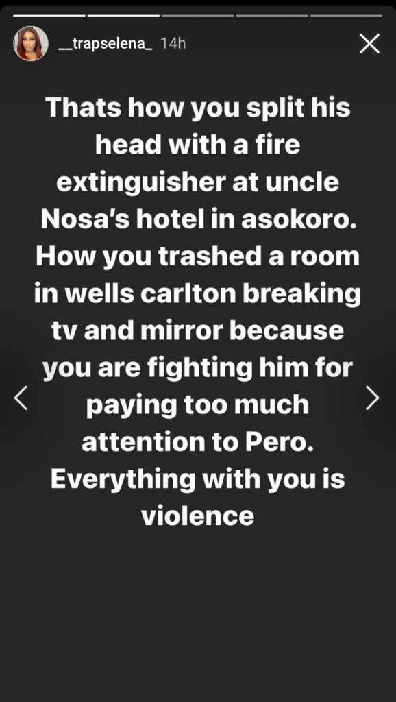 That’s why you split his head with a fire extinguisher at Uncle Nosa’s hotel at asokoro. How you trashed a room in Wells Carlton breaking TV and mirror because you were fighting him for paying too much attention to Pero. Everything with you is violence,” the report reads in part. See screenshots below: