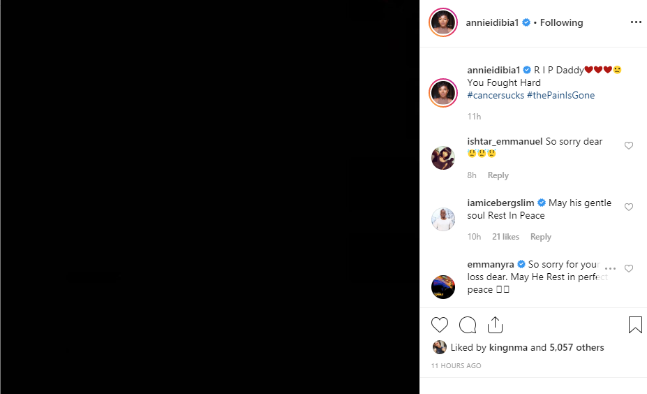 Annie who revealed that she lost her father to cancer on Instagram, wrote; R I P Daddy❤️❤️❤️ You Fought Hard #cancersucks #thePainIsGone