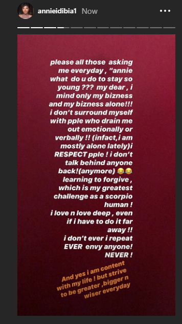 The Nollywood actress also revealed that she doesn’t surround herself with people who don’t drain her emotionally or verbally. Annie said she loves deeply and doesn’t talk behind anyone’s back ‘anymore’.