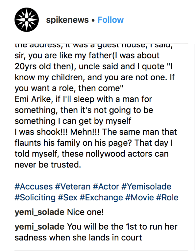 Veteran actor Yemi Solade has reacted after an aspiring actress identified as Lawal Dolapo, accused him of ‘soliciting sex’ from her in exchange for a movie role.