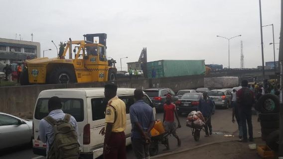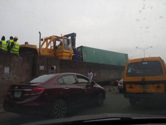 This morning, a container fell off a trailer on Ojuelegba bridge, but thankfully no one was hurt. Only last year, a container fell off this same bridge and landed on a jeep killing three people.