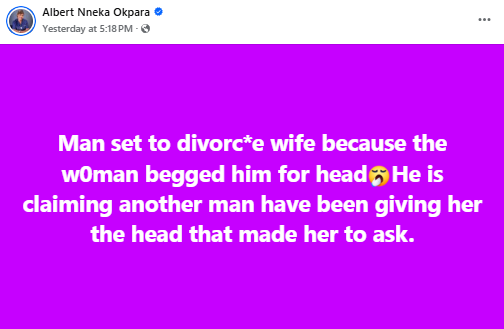 She wrote: “Man set to divorce wife because the woman begged him for head. He is claiming another man has been giving her the head that made her to ask.”