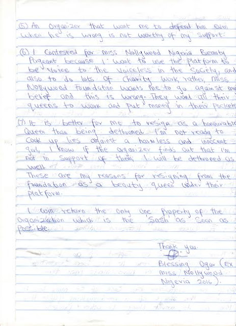 In her resignation letter made available to Lailasblog, She alleged that the organization has defaulted on their previous agreements and defaulted in availing her of her entitlements as Miss Nollywood 2016 and have already started advertising for a new queen while they are yet to pay her the prize money. She also alleged that the organizers of the pageant mandated her to collaborate the lies and allegations they leveled against the dethroned queen. a mandate which she says was against her conscience. She stated that she had better resigned because the organization would also dethrone her if she refuse to collaborate their lies.