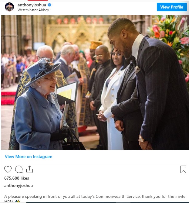 Joshua was in attendance at the Commonwealth Day service on 9 March alongside Prince Charles, 71 , as well as The Queen, and a spokesman for the British boxer confirmed that he is “fit and well” while remaining at home following the UK government’s coronavirus lockdown.