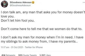 A Nigerian lady identified as Goodness Adeosun took to Twitter to state that any man who asks his girlfriend for money does not love her.