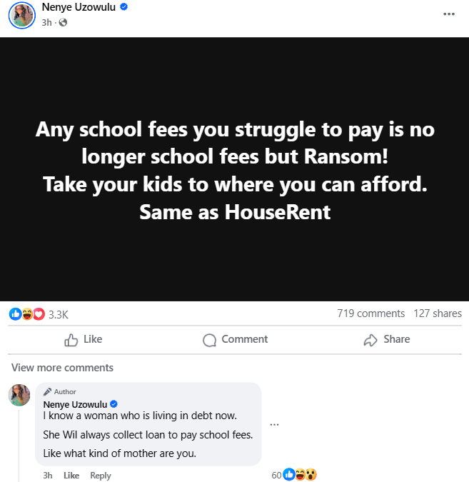 Nenye Uzowulu shared her thoughts on Facebook on Monday, cautioning parents against being pressured by private school owners over rising fees.