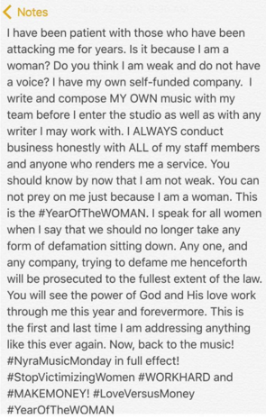 Anyone and any company trying to defame me henceforth will be prosecuted to the fullest extent of the law- Emma Nyra