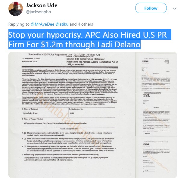 PDP apologist and US based Nigerian journalist, Jackson Ude who was reacting to a tweet by APC apologist, Mukhtar Dan’Iyan, disclosed that APC hired the U.S PR firm for $1.2m through Ladi Delano.