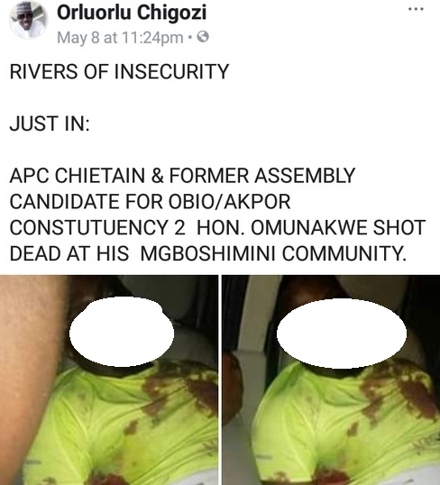 The chieftain, identified as Hon. Omunakwe was shot dead at his community, Mgboshimini. Hon. Omanukwe was formerly an Assembly candidate for Obio/Akpor Local Council Area.