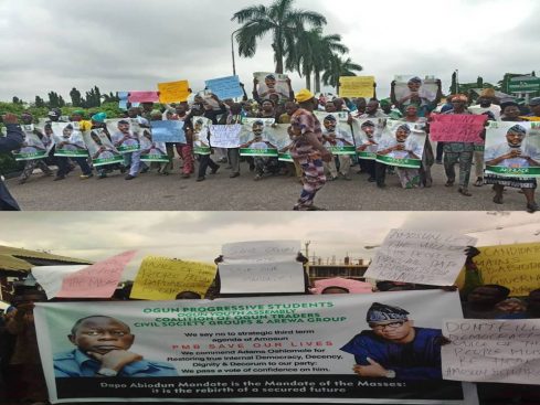 Two groups of protesters on Monday demonstrated peacefully in Abeokuta, Ogun State, over the controversial governorship primary of the All Progressives Congress (APC) which produced two candidates, Adekunle Akinlade and Dapo Abiodun.