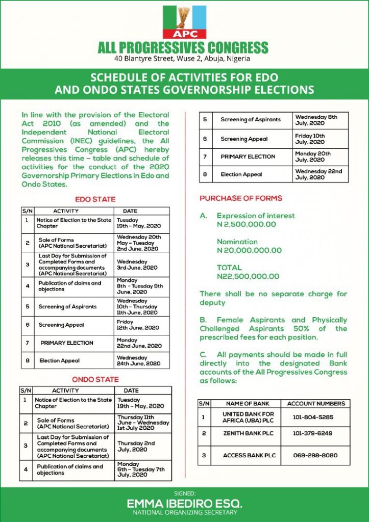 The ruling All Progressives Congress, APC, has announced Monday, June 22 and Monday, July 20 for its governorship primary elections in Edo and Ondo states.