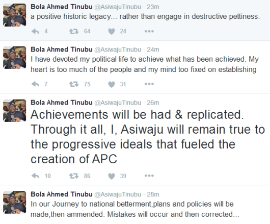 In a series of tweets, former Lagos state governor and National Leader of APC, Bola Tinubu, said APC is a party he labored with some other party members to build and will not be abandoning the party for others to control.