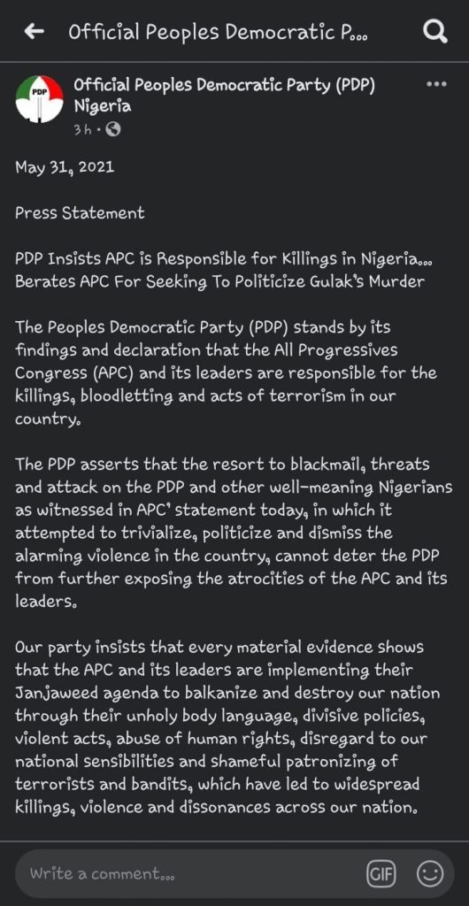 Our party sternly berates the national leadership of the APC for seeking, in its press statement today, to politicize the gruesome murder of a prominent Nigerian like Ahmed Gulak, an incident that happened in a state under its control, instead of forcefully condemning that act and giving its government a definite marching order to bring the culprits to book.