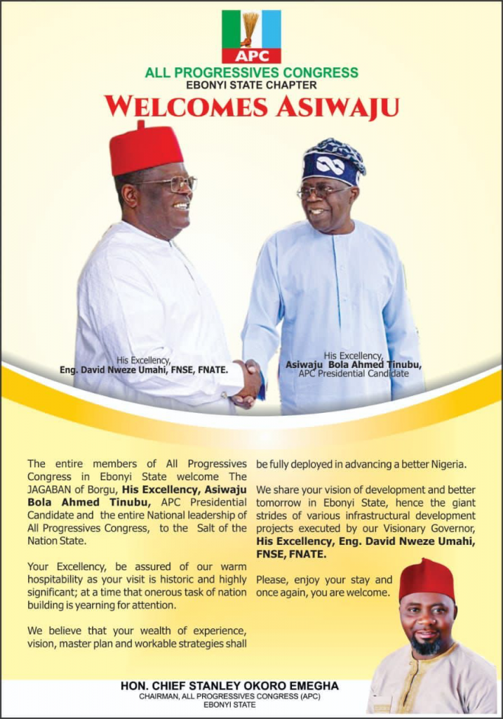 GOVERNOR UMAHI WELCOMES THE APC PRESIDENTIAL CAMPAIGN COUNCIL AND INDEED ALL APC FAITHFUL IN THE STATE TO THE APC PRESIDENTIAL RALLY AND GOVERNORSHIP CAMPAIGN FLAG-OFF IN EBONYI STATE HOLDING TMRO, THURSDAY,24TH NOVEMBER,2022*