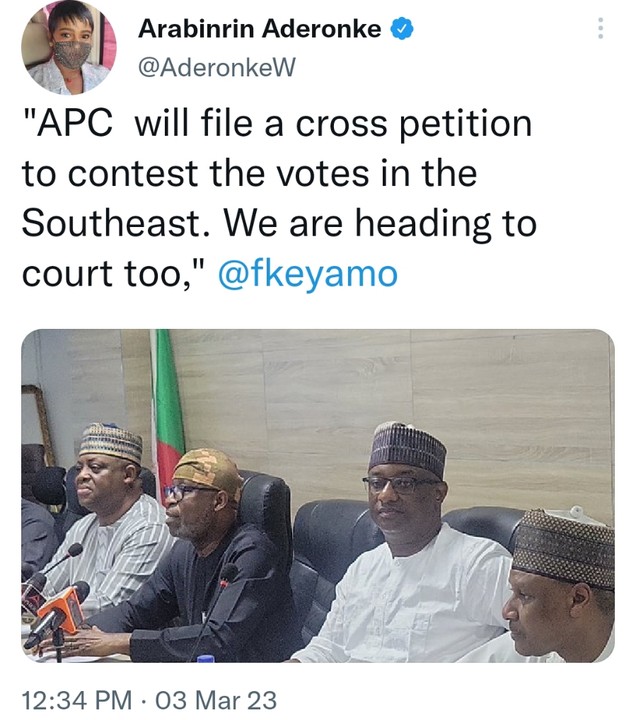 "APC will file a cross petition to contest the votes in the Southeast. We are heading to court too," @fkeyamo pic.twitter.com/vtLXYYEeEE — Arábìnrin Adérónké (@AderonkeW) March 3, 2023