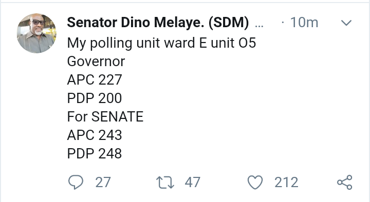 Results of the election in Kogi state are already trickling in drops. Senator Dino Melaye who represents Kogi West in the Nigerian Senate just shared the result of his own polling unit.