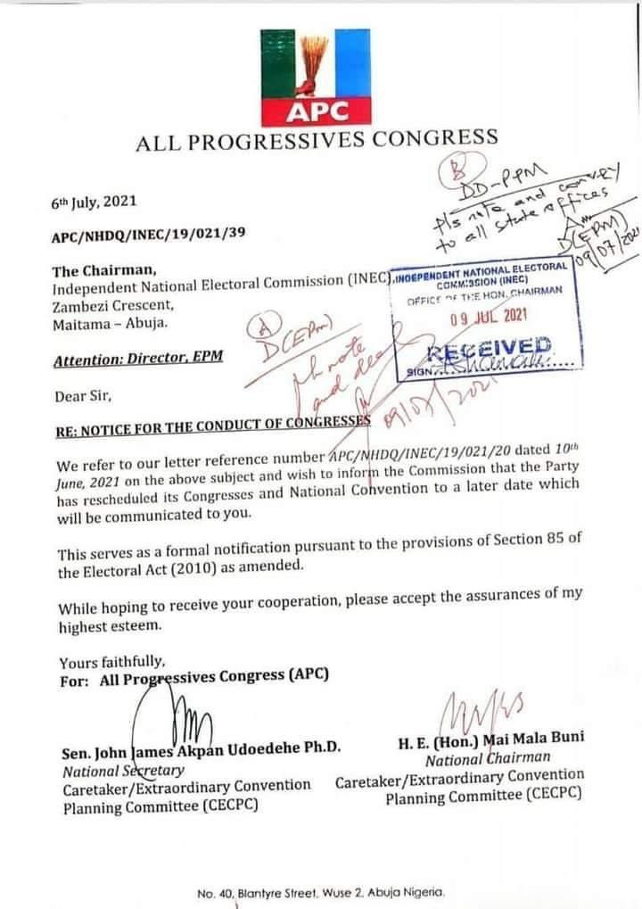 In a letter dated 6th July which was addressed to the Chairman, Independent National Electoral Commission (INEC), the party said it has rescheduled its congresses and national convention to a later date.