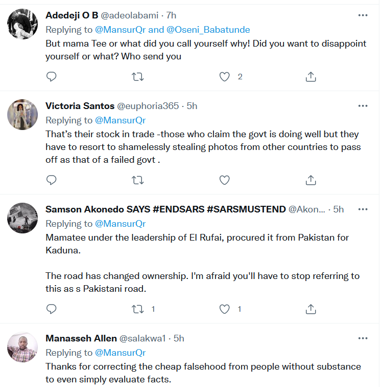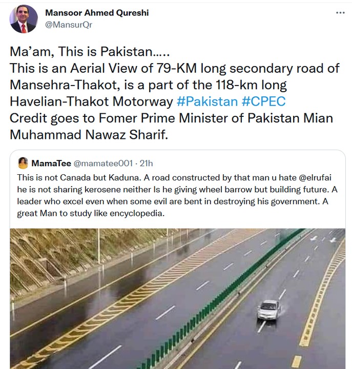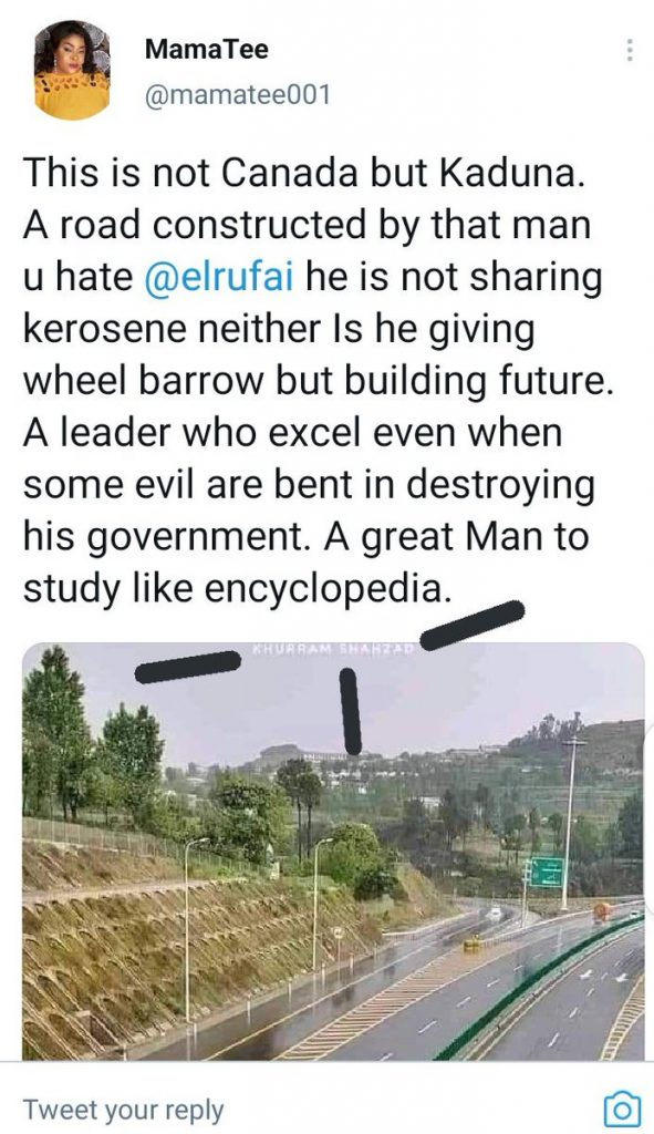 APC (MamaTee) caught red-handed posting an image of a road in Pakistan and crediting El-Rufai for constructing it.