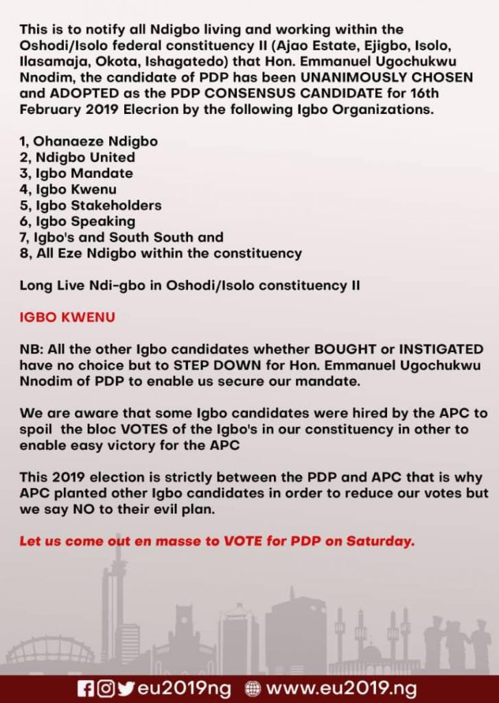NB: All the other Igbo candidates whether BOUGHT or INSTIGATED have STEP DOWN for Hon. Emmanuel Ugochukwu Nnodim of PDP to enable us secure our mandate.