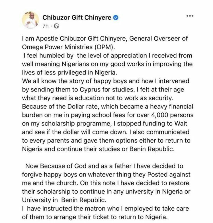 “I also communicated to every parent and gave them options either to return to Nigeria and continue their studies or go to Benin Republic. Now, because of God and as a father, I have decided to forgive Happie Boys for whatever they posted against me and the church. On this note, I have decided to restore their scholarship to continue in any university in Nigeria or Benin Republic. I have instructed the matron, whom I employed to take care of them, to arrange their ticket to return to Nigeria.”