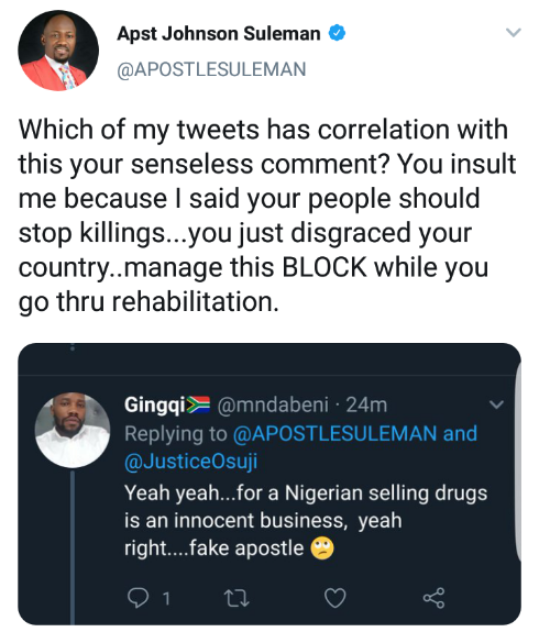 The man said in reply to one of Suleman’s tweet: “Yeah yeah…for a Nigerian selling drugs is an innocent business, yeah right…fake apostle.”