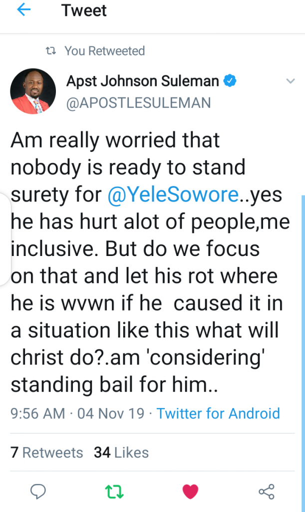 Am really worried that nobody is ready to stand surety for @YeleSowore.. yes he has hurt alot of people,me inclusive. But do we focus on that and let his rot where he is wvwn if he caused it in a situation like this what will christ do?.am ‘considering’ standing bail for him…